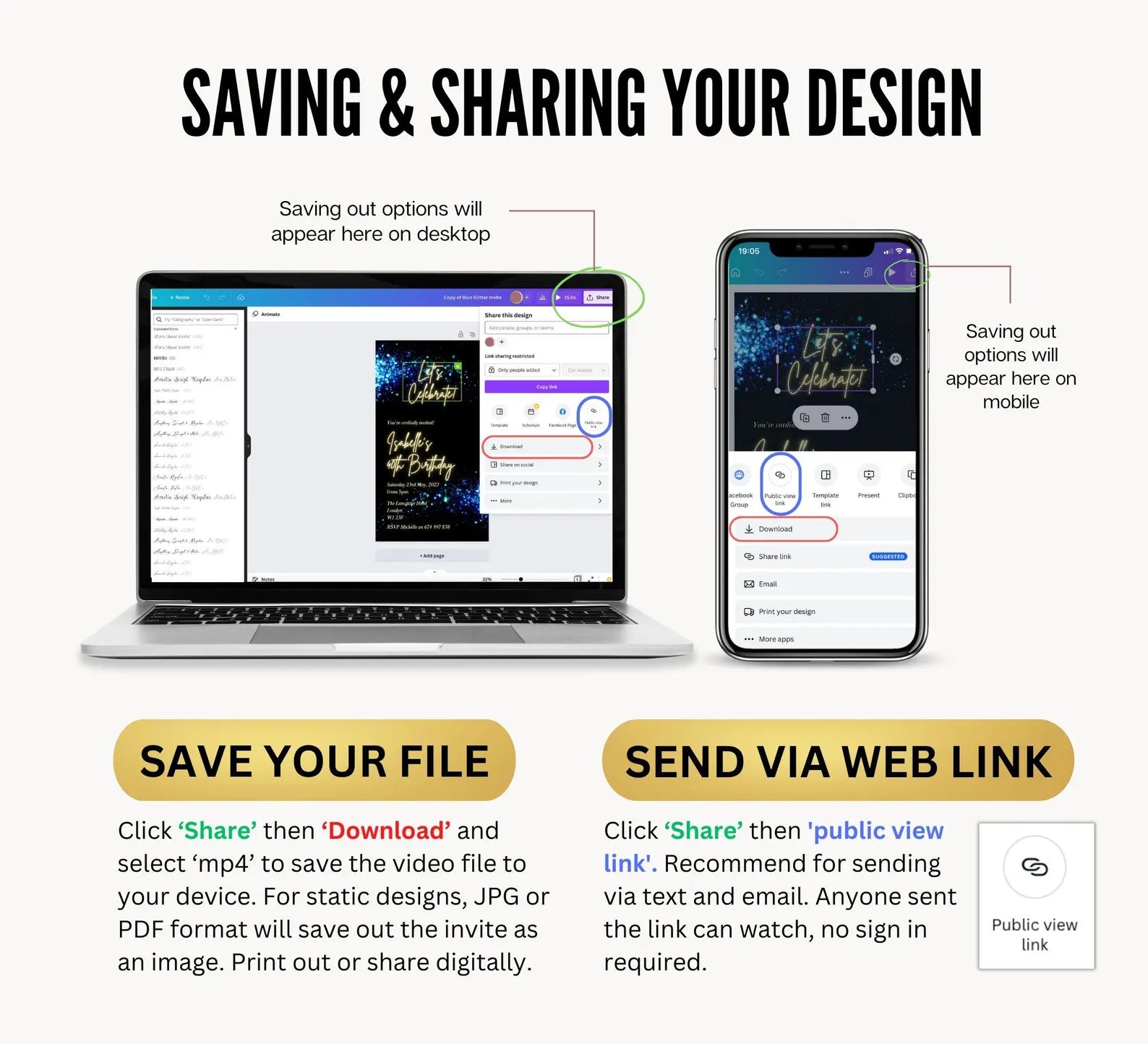 3️⃣ Make your edits and once finalised save the file to your device in mp4 format. You can also save out a web sharing link (recommended for sending via text & email)