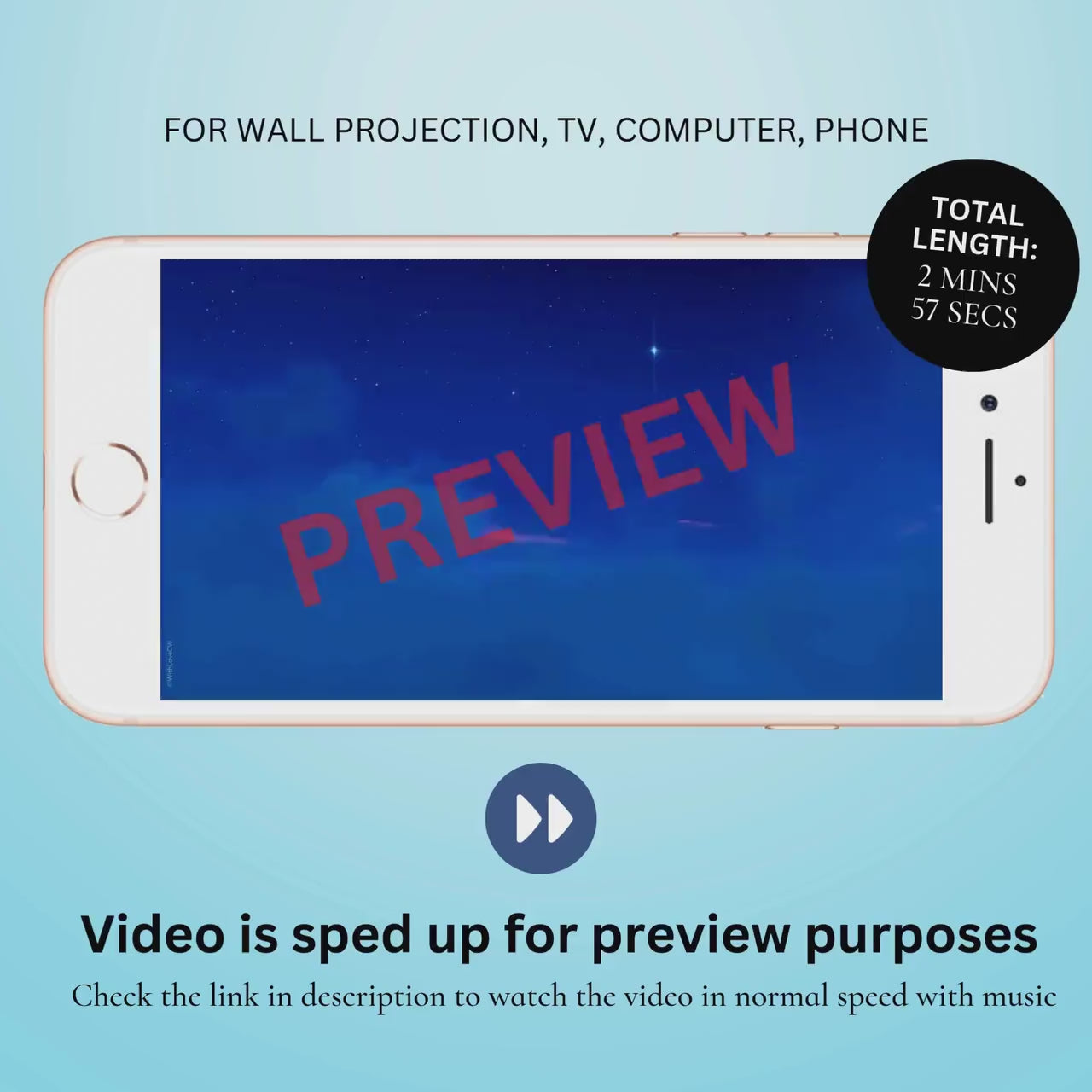 ✨ Easily share the video with friends and family through text, email, social media and messaging apps. Also can be used for wall projection and on your TV (device specific so if you need a test file to check before purchase then please contact me)