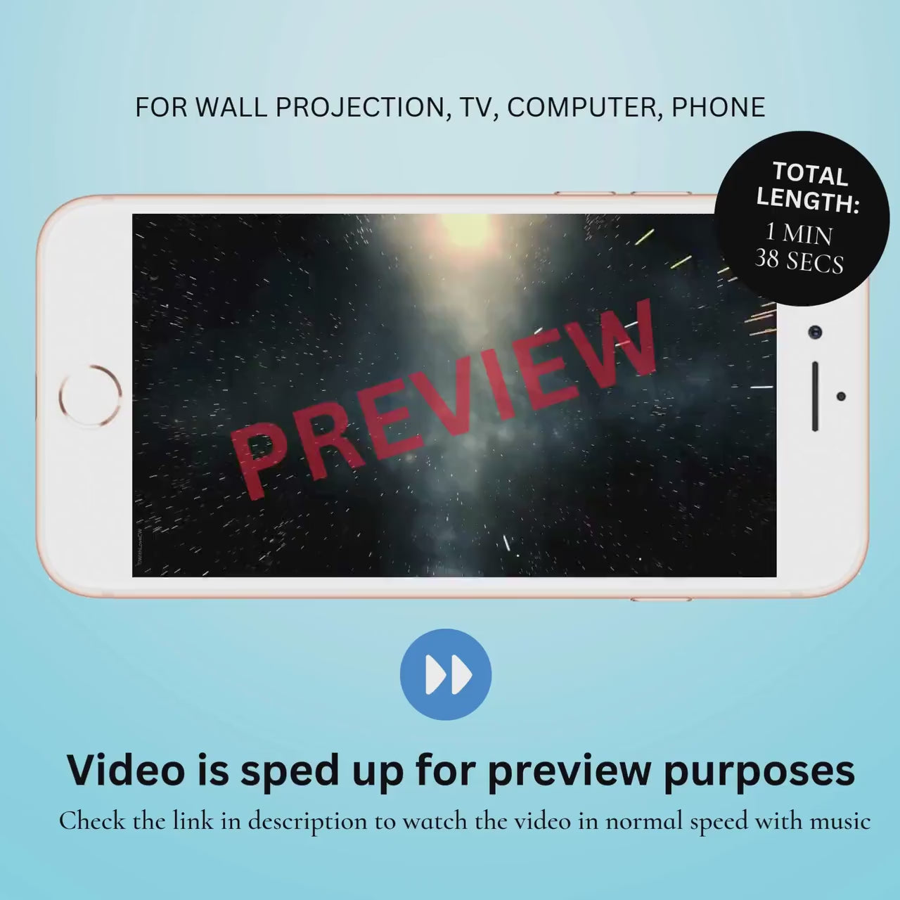 ✨ Easily share the video with friends and family through text, email, social media and messaging apps. Also can be used for wall projection and on your TV (device specific so if you need a test file to check before purchase then please contact me)